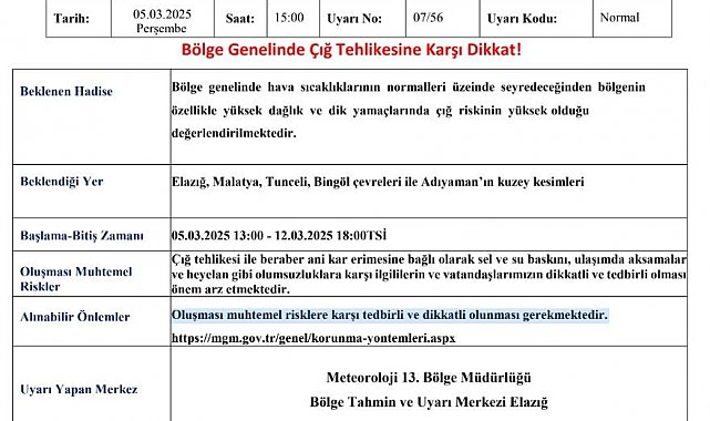 Meteoroloji 13. Bölge Müdürlüğü, Elazığ, Malatya, Adıyaman, Bingöl ve Tunceli için çığ uyarısında bulundu.