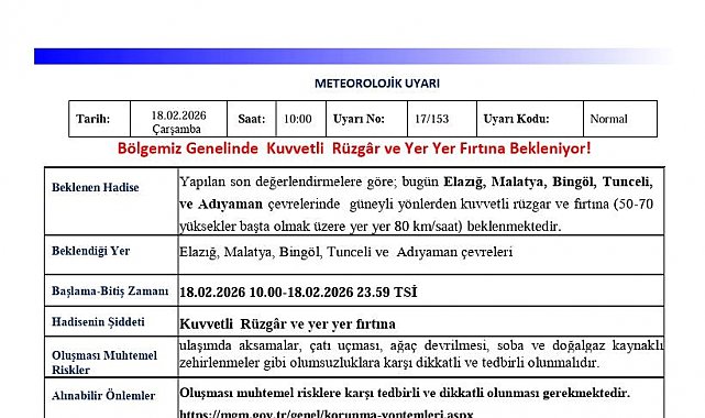 Meteoroloji 13. Bölge Müdürlüğü'nden yapılan uyarıda, "Yapılan son değerlendirmelere göre; bugün Elazığ, Malatya, Bingöl, Tunceli, ve Adıyaman çevrelerinde güneyli yönlerden kuvvetli rüzgar ve fırtına (50-70 yüksekler başta olmak üzere yer yer 80 km/saat) beklenmektedir. Ulaşımda aksamalar, çatı uçması, ağaç devrilmesi, soba ve doğalgaz kaynaklı zehirlenmeler gibi olumsuzluklara karşı dikkatli ve tedbirli olunmalıdır" denildi.