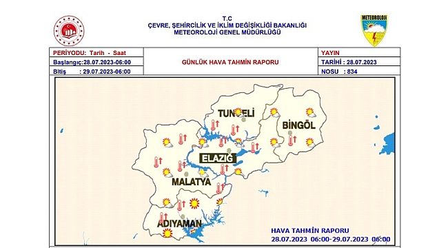 Meteoroloji 13. Bölge Müdürlüğü, Elazığ, Malatya, Bingöl, Adıyaman ve Tunceli için sıcak hava dalga uyarısı yaptı.