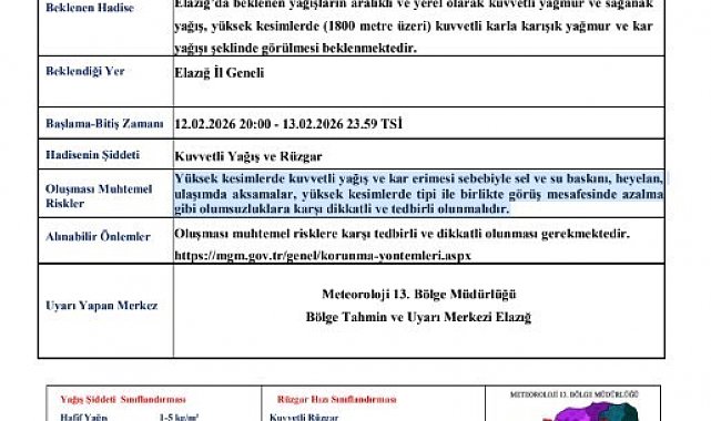Meteoroloji 13. Bölge Müdürlüğünden yapılan açıklamada, "Elazığ'da beklenen yağışların aralıklı ve yerel olarak kuvvetli yağmur ve sağanak yağış, yüksek kesimlerde (1800 metre üzeri) kuvvetli karla karışık yağmur ve kar yağışı şeklinde görülmesi beklenmektedir. Yüksek kesimlerde kuvvetli yağış ve kar erimesi sebebiyle sel ve su baskını, heyelan, ulaşımda aksamalar, yüksek kesimlerde tipi ile birlikte görüş mesafesinde azalma gibi olumsuzluklara karşı dikkatli ve tedbirli olunmalıdır" ifadelerine yer verildi.