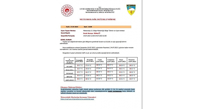Meteoroloji 13. Bölge Müdürlüğü Bölge Tahmin ve Uyarı Merkezinden yapılan açıklamada, yapılan son değerlendirmelere göre bölge genelinde havanın az bulutlu ve açık geçeceği tahmin edildiği belirtildi. Açıklamada, 'Hava sıcaklıklarının artarak 19 Temmuzdan 24 Temmuza kadar mevsim normallerinin 1 ila 5 derece üzerine çıkması beklenmektedir. Rüzgarların kuzeyli yönlerden hafif ve yer yer orta kuvvette eseceği tahmin edilmektedir. Sıcaklıklardaki yükselişe bağlı olarak güneş ışınlarının dik geldiği 11.00 ile 16.00 saatleri arasında başta yaşlılar, çocuklar ve kronik rahatsızlığı olan vatandaşlarımızın sıcak çarpmasına karşı dikkatli ve tedbirli olmaları önem arz etmektedir'' denildi.