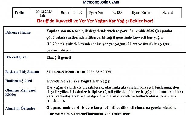Meteoroloji 13. Bölge Müdürlüğü'nden yapılan açıklamada, "Yapılan son meteorolojik değerlendirmelere göre; 31 Aralık 2025 Çarşamba günü sabah saatlerinden itibaren Elazığ il genelinde kuvvetli kar yağışı (10-20 cm), yüksek kesimlerde ise yer yer yoğun (20 cm ve üzeri) kar yağışı beklenmektedir. Kar yağışıyla birlikte oluşabilecek; ulaşımda aksamalar, kuvvetli buzlanma, don olayı ile yüksek kesimlerde tipi ve eğimli yüksek bölgelerde çığ gibi olumsuzluklara karşı vatandaşlarımızın ve ilgili birimlerin dikkatli ve tedbirli olması önem arz etmektedir" denildi.