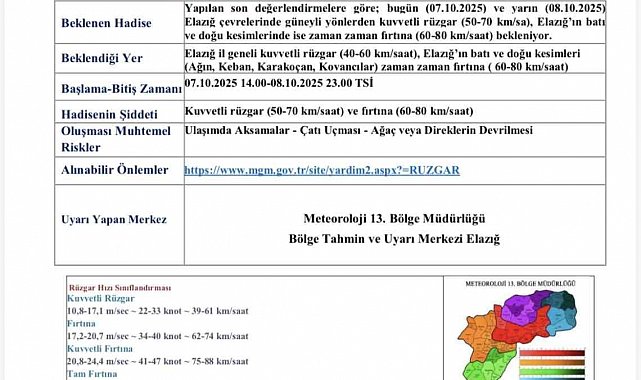 Meteoroloji 13. Bölge Müdürlüğü'nden yapılan açıklamada, "Yapılan son değerlendirmelere göre; 07.10.2025 akşam saatlerinden yarın 08.10.2025 gece saatlerine kadar Elazığ il genelinde güneyli yönlerden kuvvetli rüzgar (50-70 km/sa), Elazığ'ın batı ve doğu kesimlerinde ise zaman zaman fırtına (60-80 km/saat) , kuvvetli rüzgar ve fırtına ile ulaşımda aksamalar gibi olumsuzluklara karşı dikkatli ve tedbirli olunmalıdır" denildi.