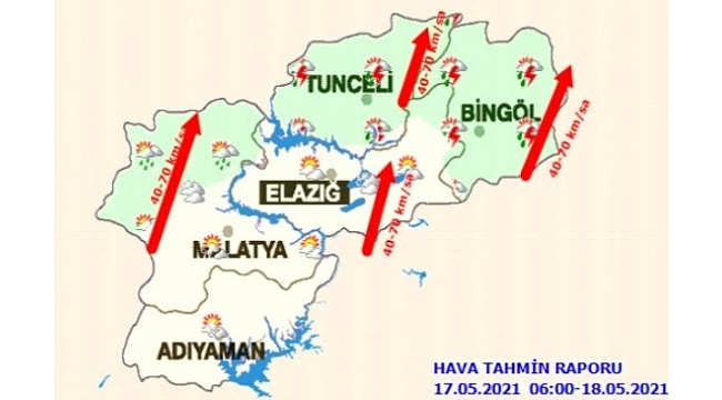 Meteoroloji 13. Bölge Müdürlüğü Elazığ Tahmin ve Uyarı Merkezi tarafından yapılan açıklamada:" Bölgemiz genelinde havanın parçalı yer yer çok bulutlu, Tunceli, Bingöl ve Malatya'nın kuzey ilçelerinde öğle saatlerinden itibaren yerel olmak üzere kısa sürekli sağanak ve gök gürültülü sağanak yağışlı geçeceği tahmin edilmektedir. Rüzgarların güneyli yönlerden orta kuvvette, yer yer kuvvetli saatte 40 ile 70 kilometre hızla eseceği beklenmektedir"denildi.