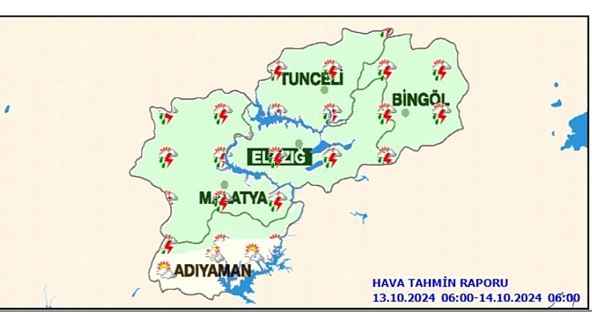 Meteoroloji 13. Bölge Müdürlüğü'nden yapılan açıklamada, "Bölgemiz genelinde havanın parçalı bulutlu, öğleden sonra Elazığ, Bingöl, Malatya, Tunceli il genelleri ile Adıyaman'ın kuzey kesimlerinin sağanak ve gök gürültülü sağanak yağışlı geçeceği; Hava sıcaklıkları mevsim normallerinin 3 ila 5 derece üzerinde seyredeceği; rüzgarların kuzeyli yönlerden hafif, yağış anında orta kuvvette eseceği tahmin edilmektedir" denildi.