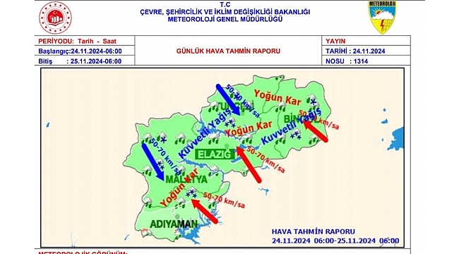 Meteoroloji 13. Bölge Müdürlüğü'nden yapılan açıklamada, "Yapılan son değerlendirmelere göre; sabah saatlerinden itibaren bölge genelinde kuvvetli yağış bekleniyor. Yağışların sabah saatlerinde yüksek kesimlerde ve akşam saatlerinden sonra havanın soğumasıyla birlikte Elazığ, Malatya, Bingöl ve Tunceli çevreleri ile Adıyaman'ın kuzey kesimlerinde karla karışık yağmur ve kar yağışı şeklinde olacağı(yer yer yoğun kar ) olacağı tahmin ediliyor. Kuvvetli yağışlarla birlikte sel ve su baskını, ulaşımda aksamalar, buzlanma, don ve tipi gibi olumsuzluklara karşı dikkatli ve tedbirli olunmalıdır. Yapılan son değerlendirmelere göre; bölge genelinde rüzgarın Malatya ve Tunceli çevrelerinde kuzeyli; Elazığ, Bingöl ve Adıyaman çevrelerinde ise güney ve güney doğulu yönlerden orta ve kuvvetli, yağış anında fırtınamsı rüzgar(50-70 km/sa) şeklinde esmesi beklendiğinden yaşanabilecek olumsuzluklara karşı dikkatli ve tedbirli olunması gerekmektedir" denildi.