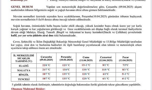 Meteoroloji 13. Bölge Müdürlüğü'nden yapılan açıklamada, "Yapılan son meteorolojik değerlendirmelere göre, Çarşamba (09.04.2025) akşam saatlerinden itibaren bölgemizin soğuk ve yağışlı havanın etkisi altına girmesi beklenmektedir. Mevsim normalleri üzerinde seyreden hava sıcaklıklarının, Perşembe (10.04.2025) gününden itibaren başlayarak mevsim normallerinin 8 ila10 derece altına ineceği tahmin edilmektedir. Soğuk havanın, önümüzdeki hafta başına kadar etkili olacağı, yüksek kesimler başta olmak üzere yer yer karla karışık yağmur ve kar yağışlarının görüleceği ve Gece sıcaklıklarında ani düşüşe bağlı olarak tarımsal faaliyetlerin devam ettiği Malatya, Elazığ, Tunceli, Bingöl ve Adıyaman'ın kuzey kesimleri(Sincik ve Çelikhan) çevrelerinde hafif, yer yer orta şiddette zirai don riski bulunmaktadır. Çevre, Şehircilik ve İklim Değişikliği Bakanlığı Meteoroloji Genel Müdürlüğü ve 13.Bölge Müdürlüğü tarafından kar yağışı, zirai don ve buzlanma hadiseleri ile ilgili hazırlanıp yayınlanacak olan tahmin ve meteorolojik erken uyarıların takip edilmesi önem arz etmektedir. Ulaşımda aksamalar,buzlanma ve don olayı, olaylara karşı dikkatli ve tedbirli olunmalıdır. Meteoroloji Genel Müdürlüğü tarafından gerek görüldükçe hazırlanacak olan anlık meteorolojik uyarıların takibini yaparak, oluşması muhtemel risklere karşı can ve mal emniyeti açısından dikkatli ve tedbirli olunması önem arz etmektedir" denildi.