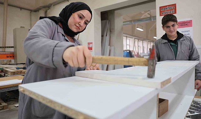 Elazığ Mesleki ve Teknik Anadolu Lisesi mobilya ve iç tasarım alanının tek kız öğrencisi Elif Yaren Bağatur, kulağında kalem, elinde çekiç ile erkek yaşıtlarına taş çıkartıyor.