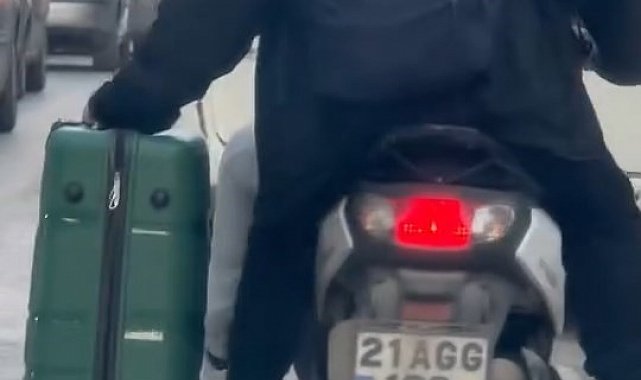 Elazığ'da 2 kişi valizi taşımak için ilginç bir yöntem seçti. Biri motosikleti kullanırken diğer ise arkada oturarak valizi tekerlekleri üzerinde gitmesini sağladı. Vali Fahri Bey Caddesi'nde ki o anlar adeta kazaya davetiye çıkartırken, görenleri ise şaşırttı. 2 gencin valiz taşıma yöntemi başka bir sürücü tarafından cep telefonu kamerası ile kaydedildi.
