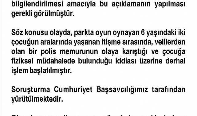 Olay, Abdullahpaşa Mahallesi'nde bulunan Işık Park'ta meydana geldi. Edinilen bilgiye göre, parkta oyun oynayan 6 yaşındaki iki çocuğun aralarında yaşanan itişme sırasında, velilerden olan bir polis memurunun olaya karıştığı ve çocuğa fiziksel müdahalede bulunduğu iddiası üzerine soruşturma başlatıldı. Başlatılan soruşturma Cumhuriyet Başsavcılığı tarafından yürütülürken olaya karışan polis memurunun görevinden uzaklaştırıldığı bildirdi.