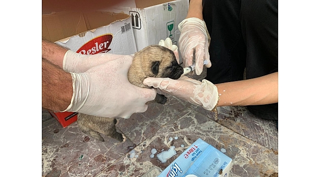 Elazığ'ın Ağın ilçesinde bir kasa içerisinde ölüme terk edildiği yerde belediye personeli tarafından bulunarak koruma altına alınan 10 yavru köpek, şırınga ile süt verilerek beslenmeye başlandı.
