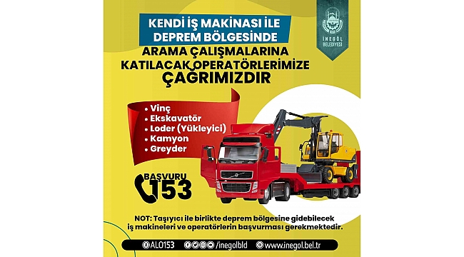 İnegöl Belediyesi, kendi iş makinası ile deprem bölgesinde arama kurtarma çalışmalarına katılabilecek operatör ve iş makinası sahiplerine çağrıda bulundu.