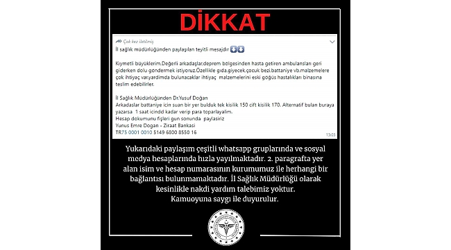 Açıklamada, Whatsapp ve sosyal medya gruplarında "İl sağlık müdürlüğünden paylaşılan teyitli mesajdır. Kıymetli büyüklerim, değerli arkadaşlar, deprem bölgesinden hasta getiren ambulansları geri giderken dolu göndermek istiyoruz. Özellikle gıda, giyecek, çocuk bezi, battaniye gibi malzemelere çok ihtiyaç var. Yardımda bulunacaklar ihtiyaç malzemelerini eski göğüs hastalıkları binasına teslim edebilirler. İl Sağlık Müdürlüğünden Dr. Yusuf Doğan. Arkadaşlar battaniye için şuan bir yer bulduk. Tek kişilik 150, çift kişilik 170. Alternatif bulan buraya yazarsa 1 saat içinde kaıar verip para toparlayalım. Hesap dökümünü, fişleri gün sonunda paylaşırız. Yunus Emre Doğan - Ziraat Bankası- TR75 0001 0010 5149 6800 8550 16" mesajının paylaşıldığı hatırlatılarak, bunun kurumla ilgili olmadığı belirtildi. Vatandaşlara uyarılarda bulunulan açıklama şu şekilde: