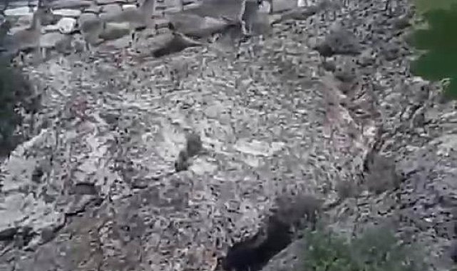 Sarp kayalıkları tırmanmada usta olan dağ keçileri bu kez tehlike saçtı. Mahallede kayalıklar arasında aniden yön değiştiren dağ keçileri, kaya parçalarının yola düşmesine neden oldu. Yoldan geçen vatandaşlar yaralanmaktan son anda kurtulurken, o anlar cep telefonu kamerasına yansıdı.