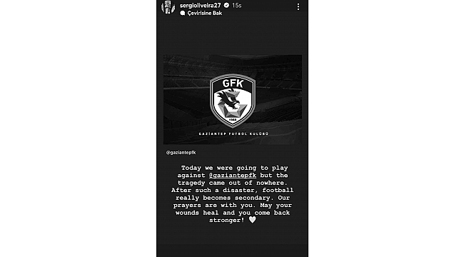 Galatasaray'ın Portekizli futbolcusu Sergio Oliveira, Kahramanmaraş'ta meydana gelen ve Gaziantep'te de ciddi hasarlara sebep olan depremlerin ardından ligden çekilen Gaziantep FK ile ilgili sosyal medya hesabından bir paylaşımda bulundu. Normal şartlar altında dün Süper Lig'de Gaziantep FK ile müsabakalarının olduğunu hatırlatan Oliveira, "Bugün Gaziantep FK ile oynayacaktık ama büyük bir trajedi yaşandı. Böyle bir felaketten sonra futbol ikincil duruma düşüyor. Dualarımız sizinle. Umarız yaralarınızı sarar ve daha güçlü geri dönersiniz" ifadelerini kullandı.