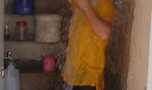 Esnaf Haşim Doğan ise sıcaktan korunmak için üzerine kovayla soğuk su dökerek serinlemeye çalıştı.