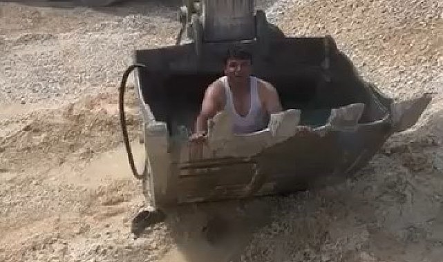 Elazığ'da sıcaktan bunalan inşaat işçileri, kepçenin küreğini havuza çevirdi. Su dolu küreğe binen işçiler serinlemenin keyfini yaşadı.