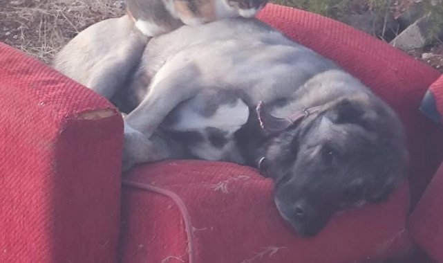 Elazığ'da üşüyen bir kedi, köpeğin üzerine yatarak ısındı ve uyudu. O anlar kedinin yanı sıra görenlerin de içini ısıttı.