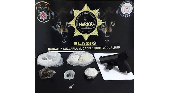 Elazığ'da polisin uyuşturucuyla mücadele kapsamında yaptığı çalışmada 1 şüpheli gözaltına alındı, çantasından ise kokain, hap ve esrarla birlikte tabanca çıktı.