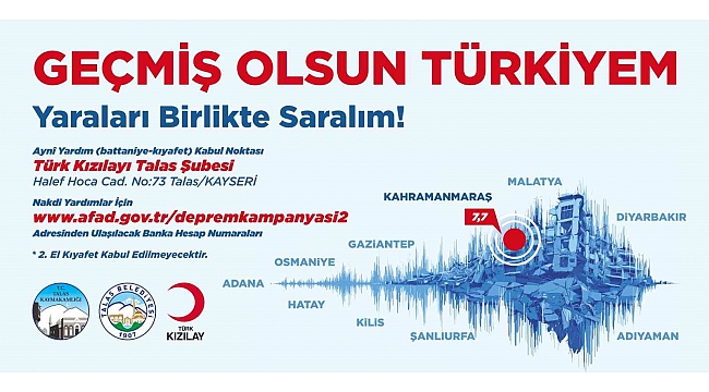 'Yaraları Birlikte Sarıyoruz' adıyla başlatılan, Talas Kaymakamlığı ve Türk Kızılay Talas Şubesi ile birlikte yürütülen kampanya için aynî yardım kabul noktası oluşturuldu. Türk Kızılay Talas Şubesi'nin yeni açılan Halef Hoca Caddesi No:73'teki hizmet binasında toplanan battaniye ve kıyafetler, koordineli şekilde deprem bölgesine gönderilecek. Yetkililer, ikinci el kıyafet kabul edilmeyeceğine dikkat çekerek, yardımseverlere kullanılmış kıyafet getirilmemesi uyarısında bulundu.