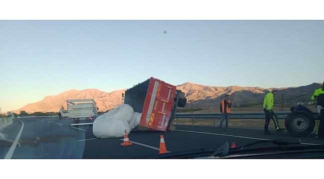 Olay, Elazığ-Bingöl karayolu 23'üncü kilometrede meydana geldi. Edinilen bilgiye göre, plakası ve sürücüsü belirlenemeyen küspe yüklü traktör, seyir halindeyken römorkunun arka sol tekerinin yerinden çıkması üzerine yan yattı. Traktörün römorkunda yüklü olan küspeler ise yol kenarına devrildi.