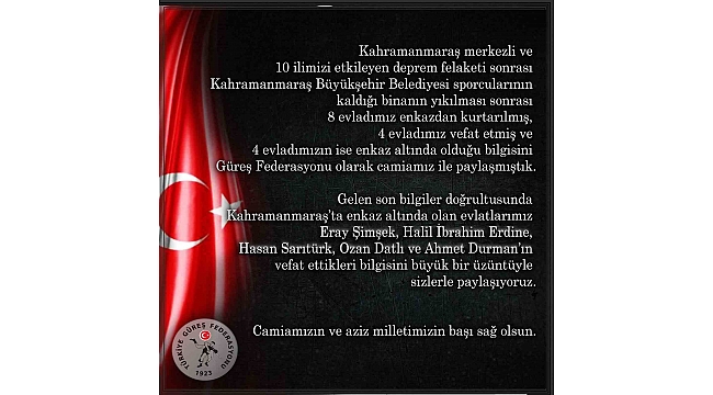 Türkiye Güreş Federasyonu (TGF), güreşçiler Eray Şimşek, Halil İbrahim Erdine, Hasan Sarıtürk, Ozan Datlı ve Ahmet Durman'ın depremde vefat ettiğini duyurdu.
