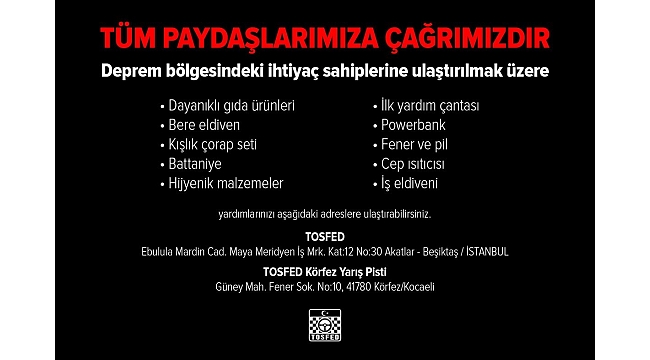 "Deprem bölgesindeki ihtiyaç sahiplerine ulaştırılmak üzere; Dayanıklı Gıda Ürünleri, Bere Eldiven, Kışlık Çorap Seti, Battaniye, Hijyenik Malzemeler, İlk Yardım Çantası, Powerbank, Fener ve Pil, Cep Isıtıcısı, İş Eldiveni yardımlarınızı TOSFED Ebulula Mardin Cad. Maya Meridyen İş Mrk. Kat:12 No:30 Akatlar - Beşiktaş / İSTANBUL ve TOSFED Körfez Yarış Pisti Güney Mah. Fener Sok. No:10, 41780 Körfez / KOCAELİ adreslere ulaştırabilirsiniz"