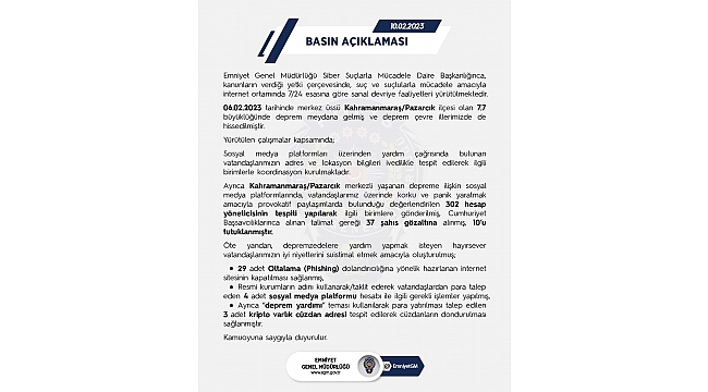 Merkez üssü Kahramanmaraş'ın Pazarcık ve Elbistan ilçesi olan 7,7 ve 7,6 büyüklüğünde meydana gelen deprem çevre illerde de hissedildi. EGM Siber Suçlarla Mücadele Daire Başkanlığı kanunların verdiği yetki çerçevesinde, suç ve suçlularla 7 gün 24 saat esasında sanal devriyeler ile mücadelesini sürdürüyor.