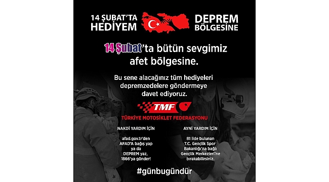 Türkiye Motosiklet Federasyonu (TMF), Türkiye'yi derinden sarsan depremlerin ardından, afet bölgesine yardım çağrısında bulundu. Federasyondan '14 Şubat'ta Hediyem Deprem Bölgesine' başlıklı yapılan yapılan açıklamada, "14 Şubat'ta bütün sevgimiz afet bölgesine. Bu sene alacağınız tüm hediyeleri depremzedelere göndermeye davet ediyoruz" denildi.