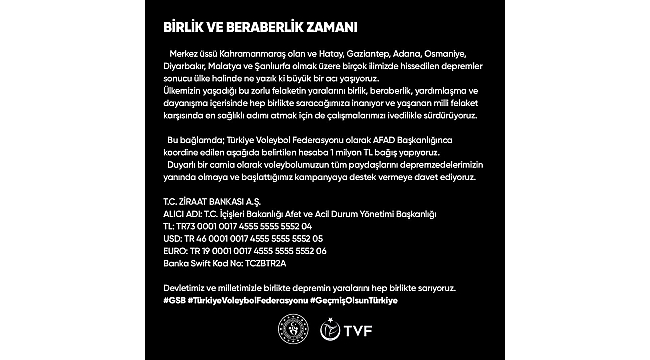Türkiye Voleybol Federasyonu (TVF), merkez üssü Kahramanmaraş ve çevre illerde depremden etkilenen depremzedeler için 1 milyon TL nakdi yardımda bulundu.