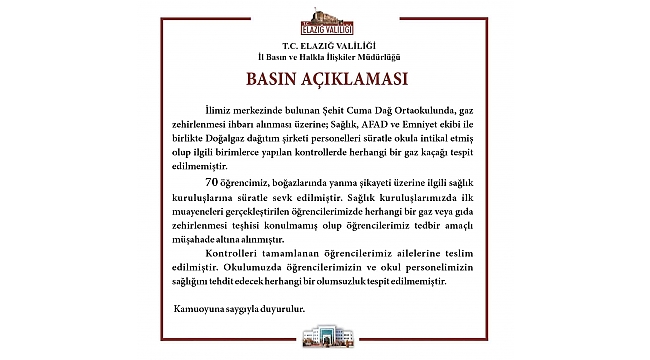 Valilik tarafından yapılan açıklamada, "İlimiz merkezinde bulunan Şehit Cuma Dağ Ortaokulunda, gaz zehirlenmesi ihbarı alınması üzerine, Sağlık, AFAD ve emniyet ekibi ile birlikte Doğalgaz dağıtım şirketi personelleri süratle okula intikal etmiş olup ilgili birimlerce yapılan kontrollerde herhangi bir gaz kaçağı tespit edilememiştir. 70 öğrencimiz, boğazlarında yanma şikayeti üzerine ilgili sağlık kuruluşlarına süratle sevk edilmiştir. Sağlık kuruluşlarımızda ilk muayeneleri gerçekleştirilen öğrencilerimizde herhangi bir gaz veya gıda zehirlenmesi teşhisi konulmamış olup öğrencilerimiz tedbir amaçlı müşahede altına alınmıştır. Kontrolleri tamamlanan öğrencilerimiz ailelerine teslim edilmiştir. Okulumuzda öğrencilerimizin ve okul personelimizin sağlığını tehdit edecek herhangi bir olumsuzluk tespit edilememiştir" denildi.