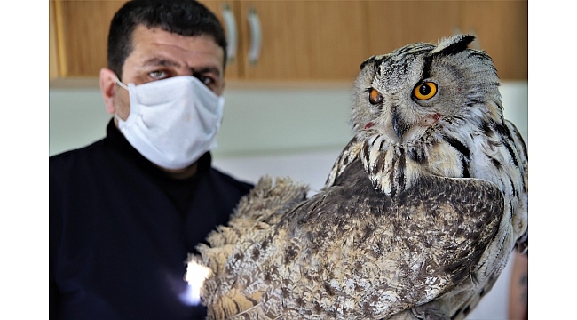 Elazığ'da ateşli silahla kanadı ve gözünden vurulduğu için uçamayan kulaklı orman baykuşu, vatandaşlar tarafından bulunarak tedavi altına alındı.