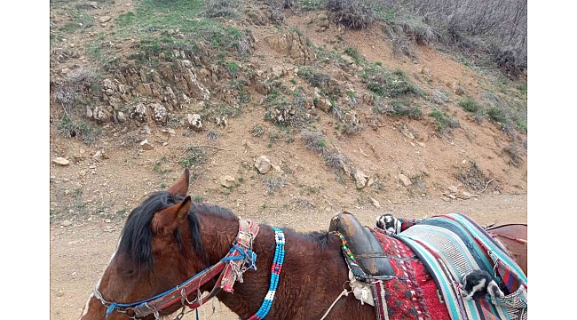 Elazığ'da havaların ısınmasıyla birlikte hayvanlarını otlatmak için yaylaya giden göçerin yeni doğan iki oğlağı at üstünde heybede taşıması görenlerin içini ısıttı.