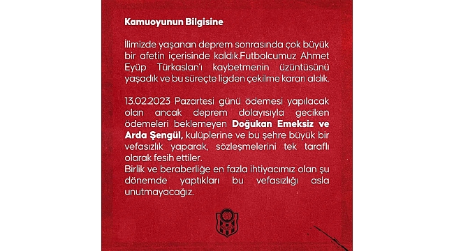 Yeni Malatyaspor, Doğukan Emeksiz ve Arda Şengül'ün deprem nedeniyle ödemelerinin gecikmesinden dolayı sözleşmelerini tek taraflı feshettiğini açıkladı. Malatyaspor oyunculara, "Bu vefasızlığı asla unutmayacağız" diyerek tepki gösterdi.