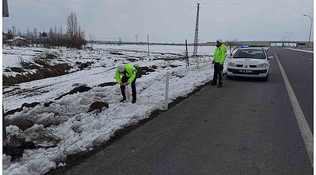 Konya'nın Seydişehir ilçesinde devriye görevi yürüten trafik ekibi yol kenarında gördükleri yavru köpekleri besledi.
