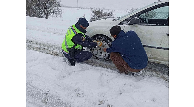 Elazığ'da etkili olan kar yağışı halen devam ederken, jandarma ve emniyet ekipleri yolda kalan araçlara zincir takarak vatandaşlara çorba ikramında bulundu.