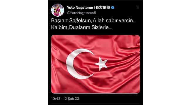 Japonya'da FC Tokyo forması giyen Yuto Nagatomo depremzedelere destek için sosyal medya hesabından, "Başınız sağ olsun, Allah sabır versin. Kalbim, dualarım sizlerle" paylaşımını yaptı.